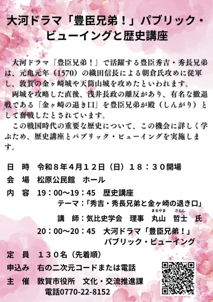 知り合いの敦賀FMのパーソナリティーさんからのお話だったことに加え、4月12日(日)に開催する“NHK大河ドラマ「豊臣兄弟!」パブリック・ビューイング&歴史講座”(講座は気比史学会が担当)の告知にもなると、二つ返事でお引き受けしたもの。