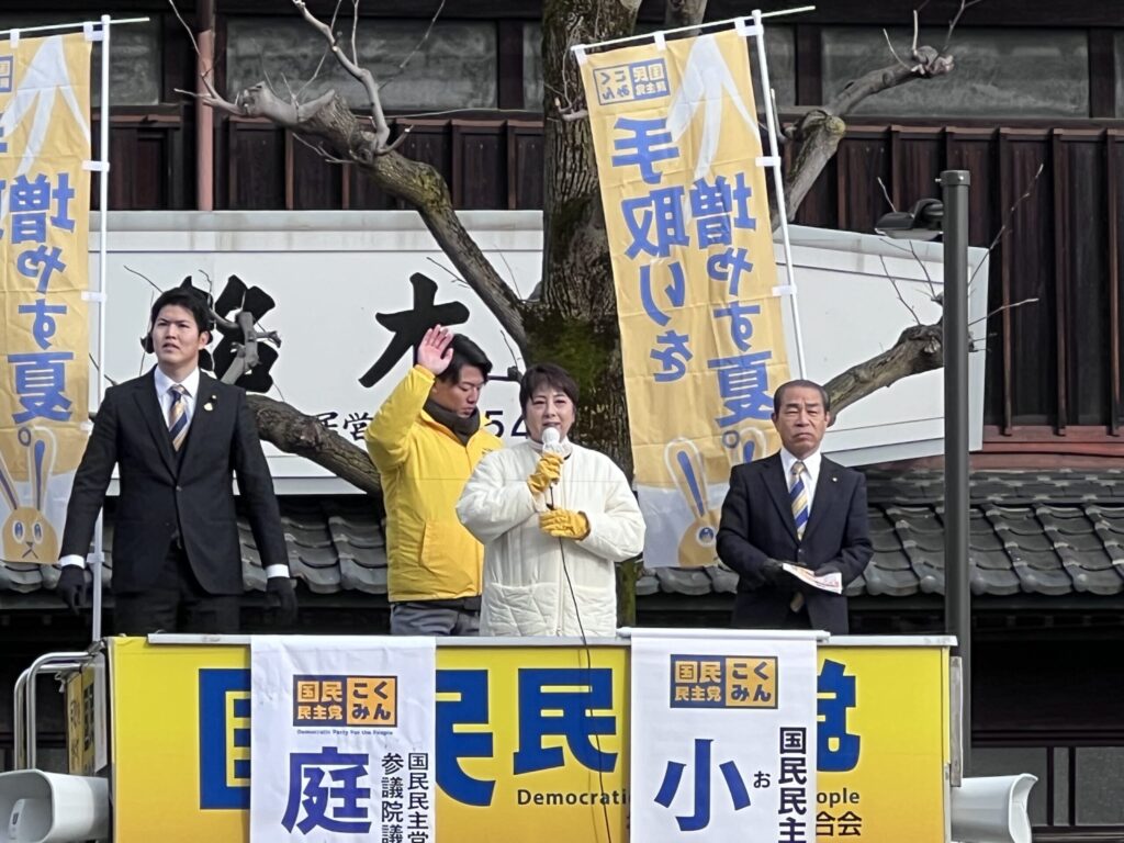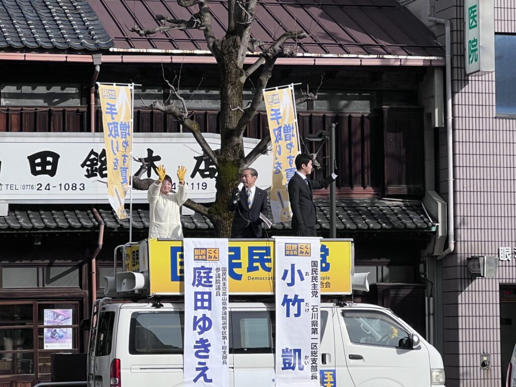 こちらは、5日のブログでご案内していたものですが、国民民主党の福井、石川、富山、それぞれの県連が連携のもと、北陸選出の小竹かい衆議院議員(石川1区)、庭田ゆきえ参議院議員(富山)と各県連所属議員にて、バトンをつなぎ街頭演説会をしていくというもの。