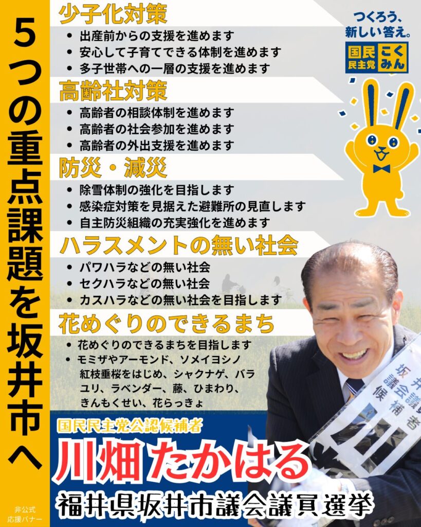 坂井市議選!期日前投票も「川畑たかはる」、投票日の4月19日も「川畑たかはる」!