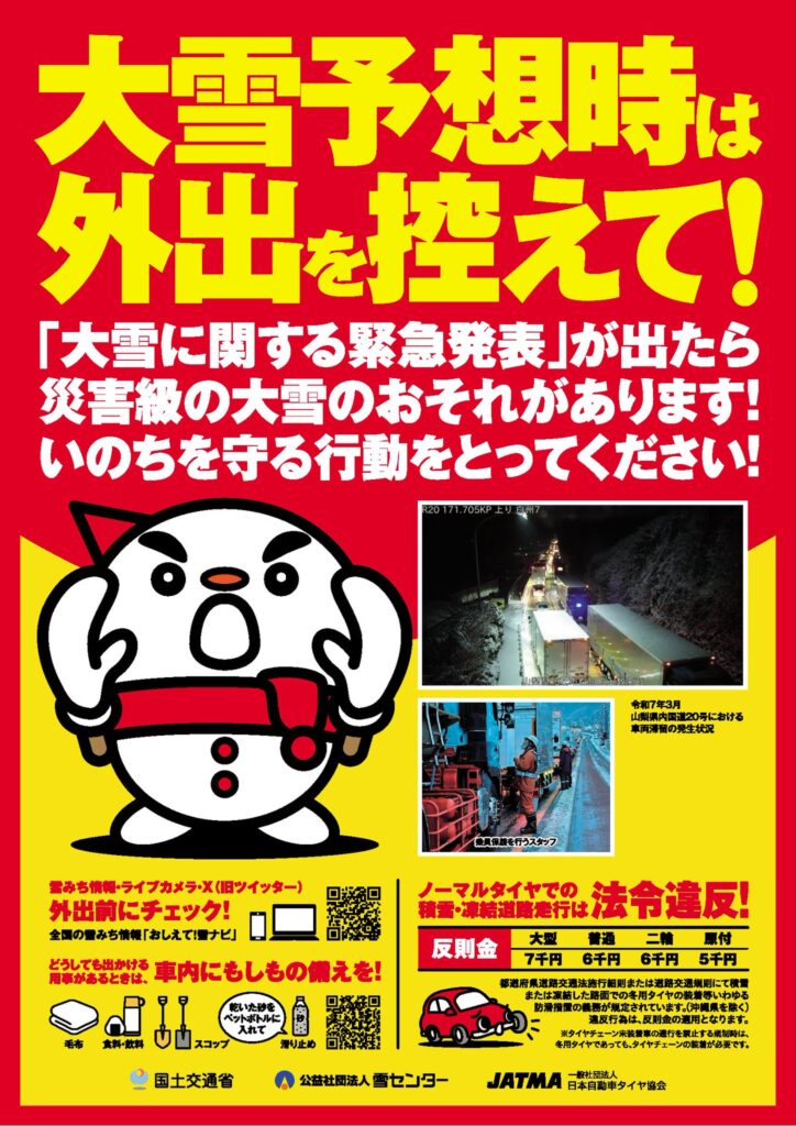 雪国にお住まいの方は当然のこととして準備されていますが、昨日のような「大雪警報」発令時などは特に、降雪区域に流入される方におかれましては「これくらいなら大丈夫だろう」の甘い考えがご自身の危険、そして大きな被害や影響を及ぼすことを念頭に、極めて慎重に対応いただけますようお願いいたします。