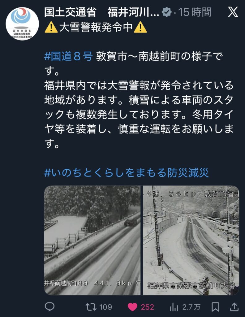 【(参考まで)昨日の国土交通省近畿地方整備局福井国道事務所のXポストより引用】