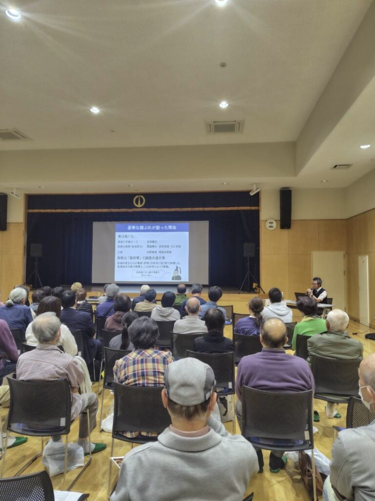 【会場の松原公民館には多くの参加者。右奥でマイクを持つのが講師の丸山さん。】