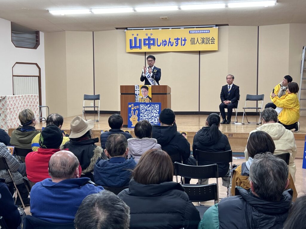 福井1区では「山中しゅんすけ」候補が、寒さをもろともせず、日中はポイント街頭演説をはさみながら街宣カーで回り、夜は各地の公民館などでの個人演説会を開催。