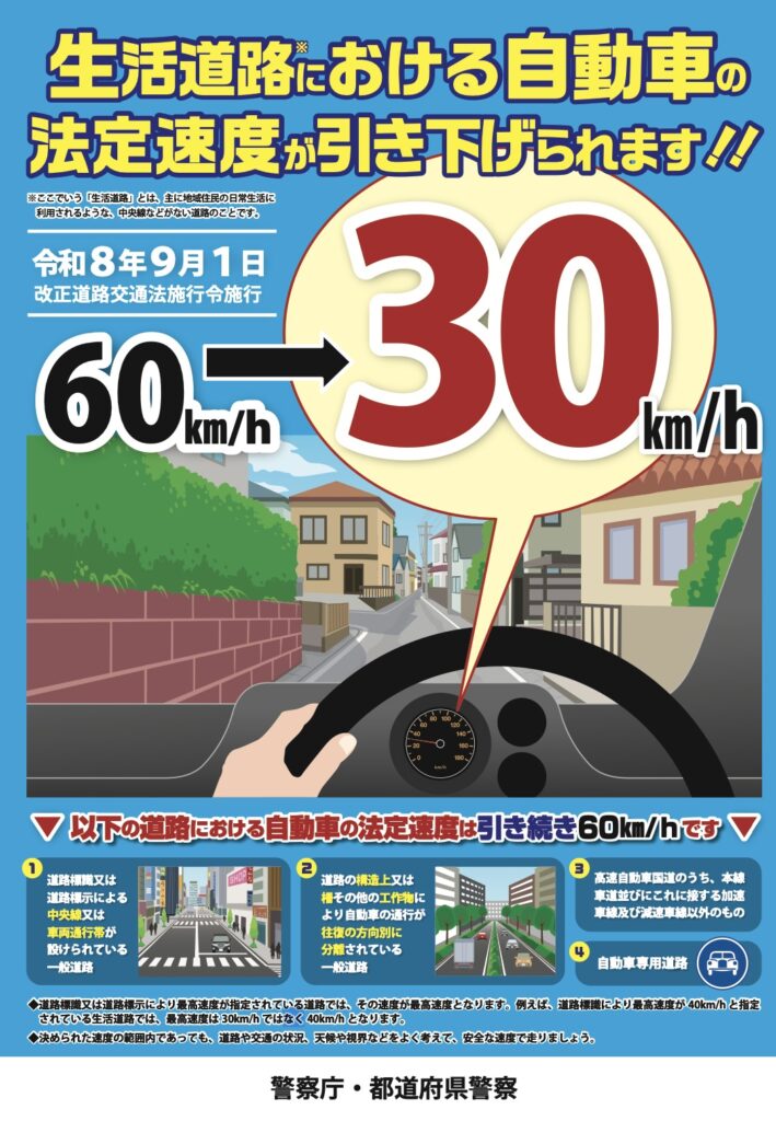 調べてみると、施行は令和8年9月1日(火)で、道路標識や標示による速度制限がない場合、自動的に30km/hが上限となるとされており、これを周知するとともに、本内容を踏まえた事業計画に見直すことにした次第です。