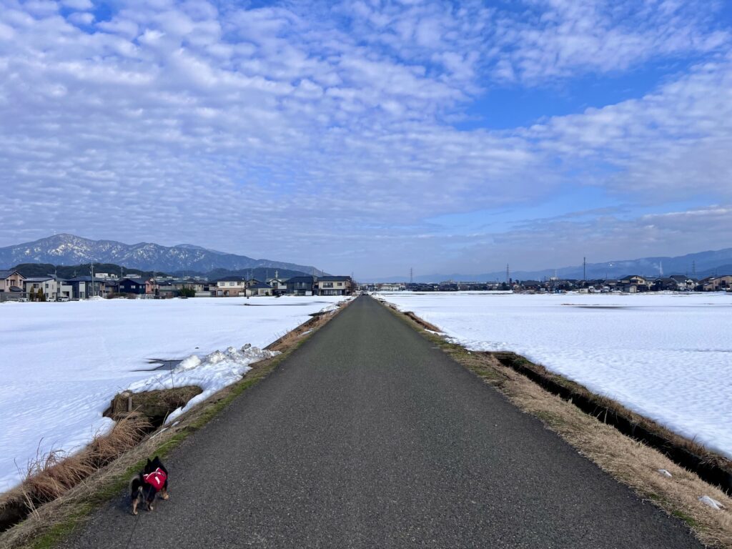 雪解けがはじまった地面は「さざ波」のようで、空を見ると「雪」のよう。