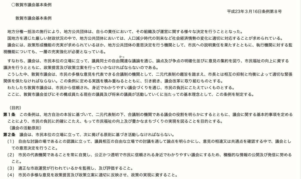 敦賀市議会に関する条例を見るに、まず「敦賀市議会基本条例」(平成23年3月16日条例第8号)にはこうあります。