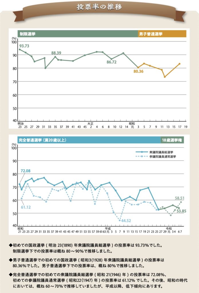 【制限選挙からの投票率推移(現在・未来のくらしに役立つ情報誌「総務省」2025年12月号より抜粋引用)】