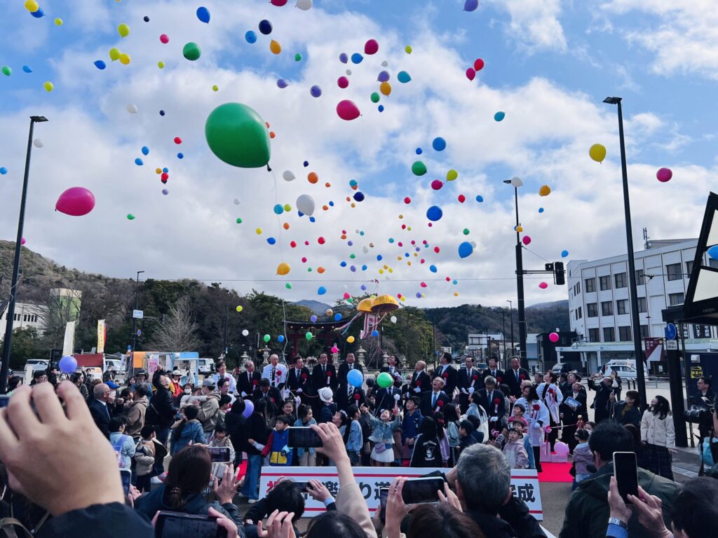 総事業費約2.6億円、施工延長約240mの整備が完成し、石田嵩人福井県知事をはじめ、多くの来賓、関係者が集うなか行われた完成式典では、歩行空間の活用はもとより、神楽通りの魅力をさらに高め、賑わいの拠点として敦賀の発展につなげていただきたいなどとの言葉が多くありました。