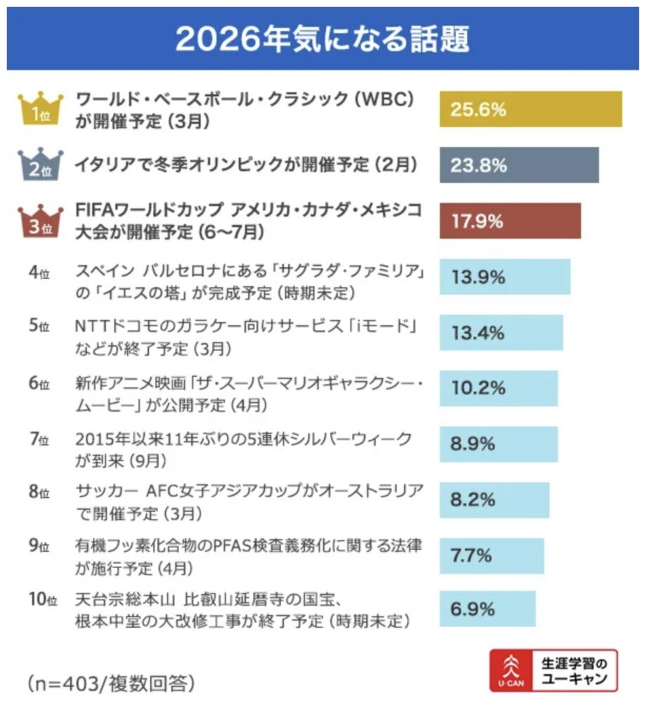 通信教育を手掛ける株式会社ユーキャンが、20代~60代の男女403名を対象に、2026年のトレンド予測調査を実施したところ、2026年注目の出来事には、1位「WBC」(25.6%)、2位「イタリア冬季オリンピック」(23.8%)、3位「FIFA W杯」(17.9%)となったとのこと。