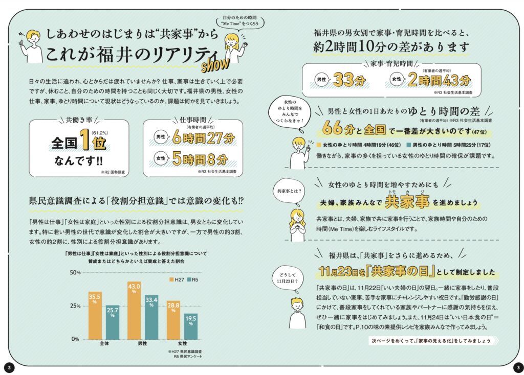 福井県は、共働き率が高く(61.2% 全国第1位)、働く女性が多い一方、家事の多くを女性が担っており、男性の家事・育児の参加や女性の家事負担軽減を促進するため、夫婦や家族がともに家事を行うことで、自分時間や家族時間を楽しむライフスタイル、「共家事(トモカジ)」を促進。